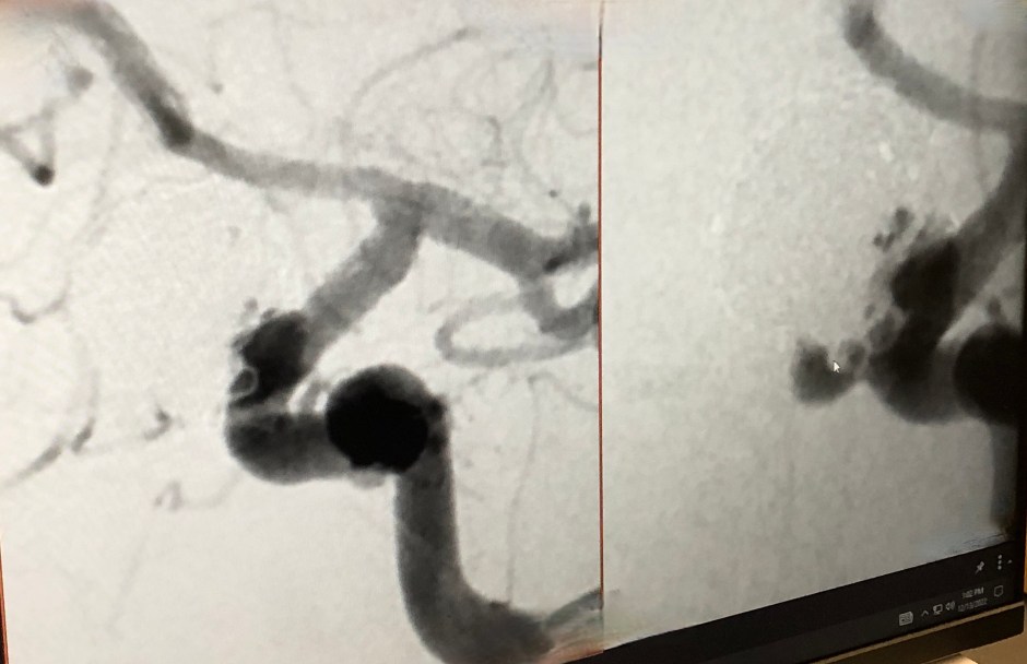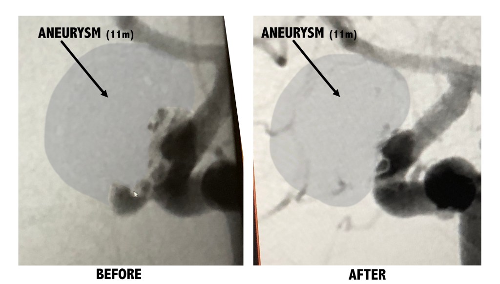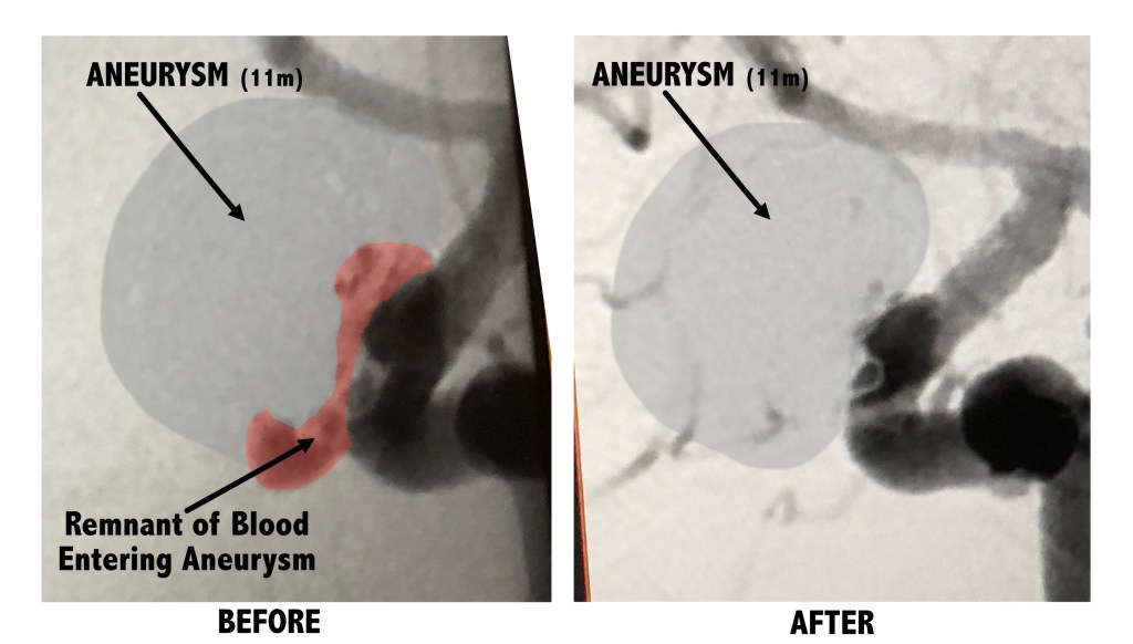 Below are a few photos I took of my images on the doctor’s computer screen. They aren’t the best, but I tried to indicate where things are for my readers. The two images placed side-by-side were backwards on his screen showing the AFTER image first, then the BEFORE image after it, so I had to cut them apart, flip them and I tried to keep them around the same size for scale. Hopefully, you’ll get the idea. And yes, I DO know I should have added another “m” for the size of my aneurysm. Don’t @ me. It took me a long time to get these images right and I’m too tired and busy to change them. 🙂