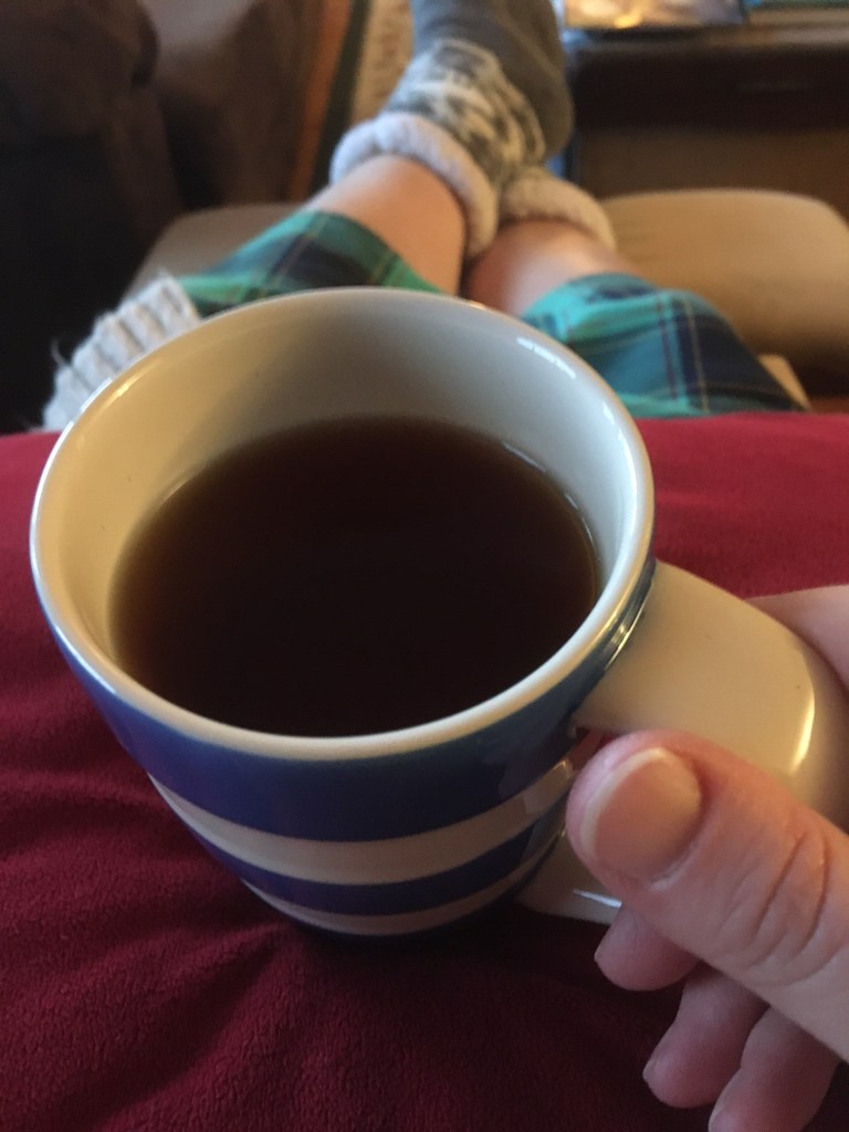I slowly got dressed, Dave went out to pull the car around, and off we went for the hour and a half drive home. The drive pooped me out so we just drove through the drive-thu for a quick meal. I got home, promptly said “Hi” to the kitties and crashed on my own bed for a 3-hour nap. Oh, and I enjoyed a GOOD cup of hot tea.